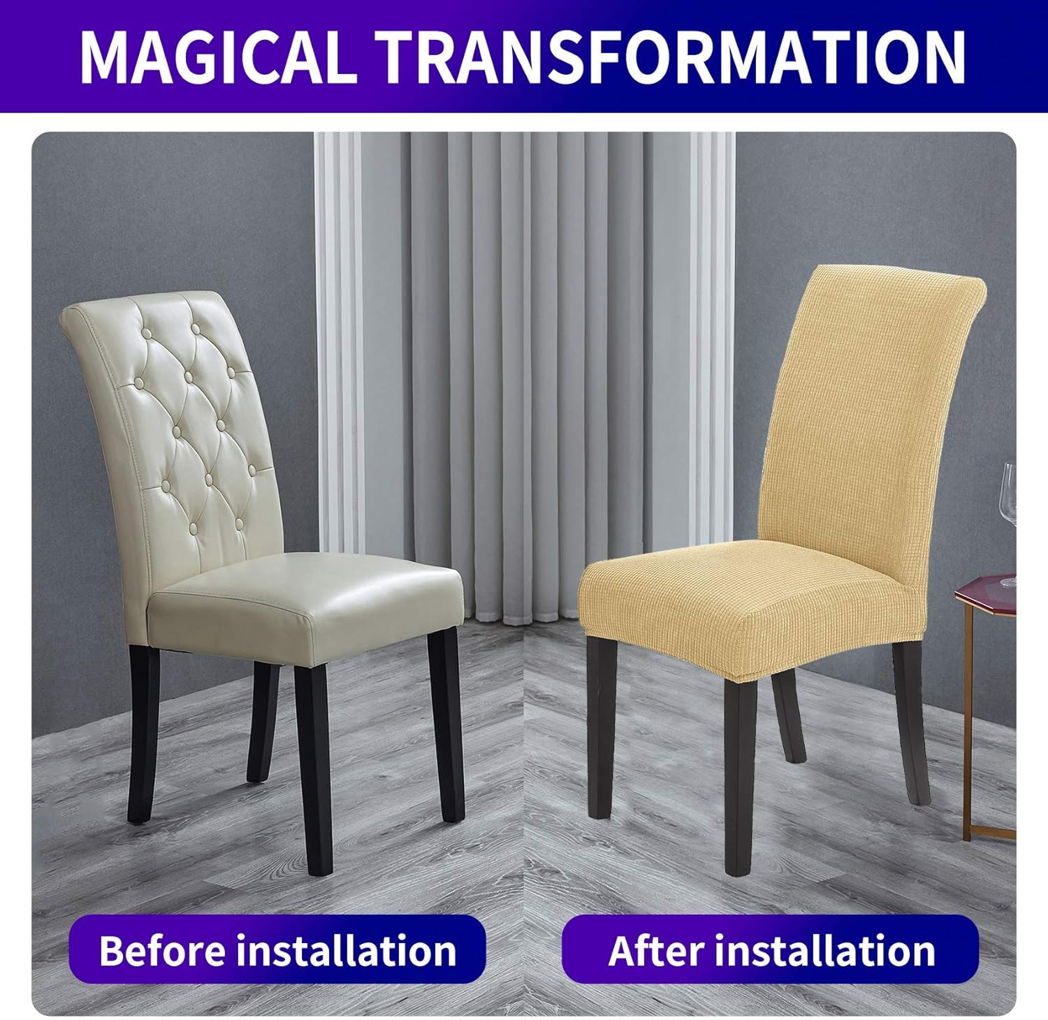 - Easy Installation, Simple Care. Easily slip on, instantly transform chairs to a brand new look. Machine washable in cold water, gentle cycle, no bleach, Ironing free.