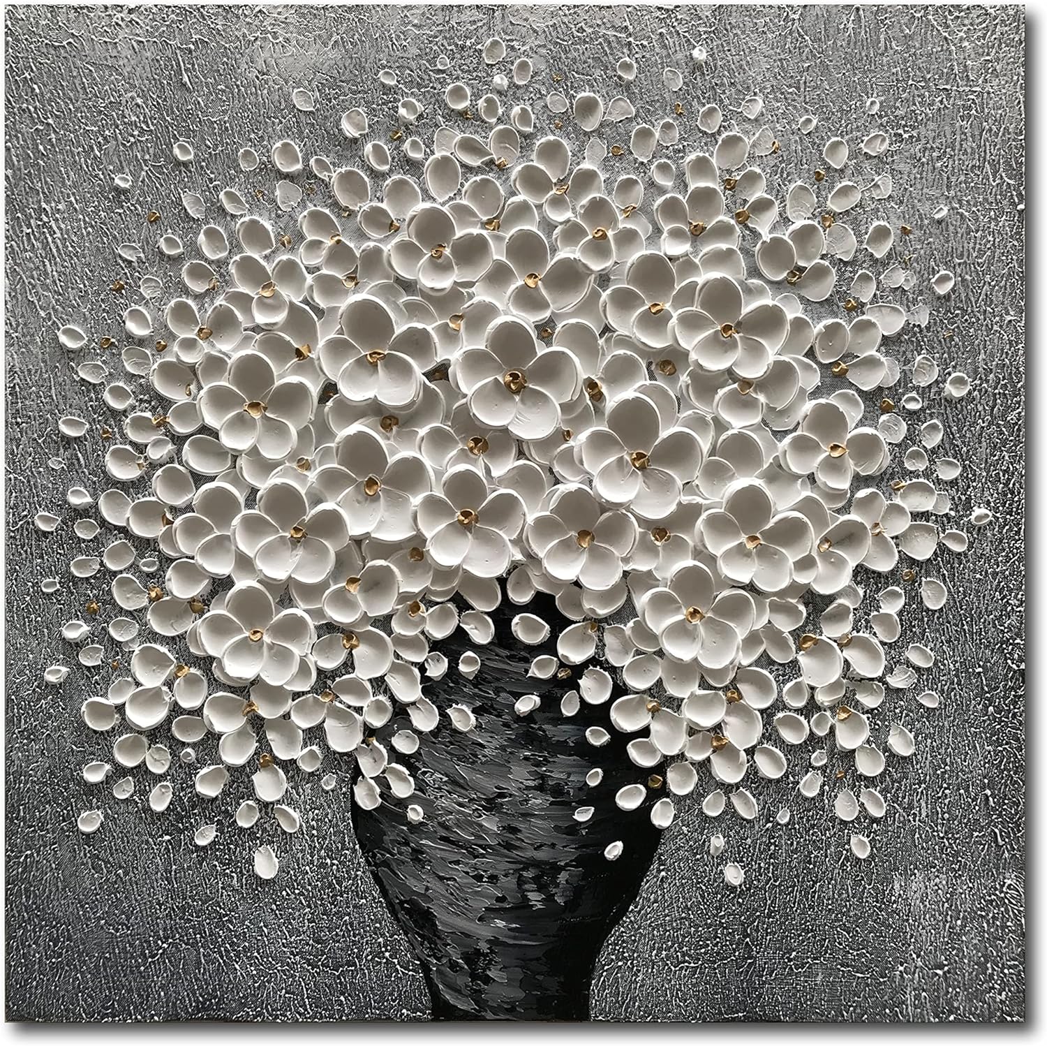 100% Hand-Painted White Flower Art Oil Painting, Modern Home Furnishing Canvas Painting Decoration, 3D Abstract Mural Painting,24x24 inch Frame Wall Art Hanging