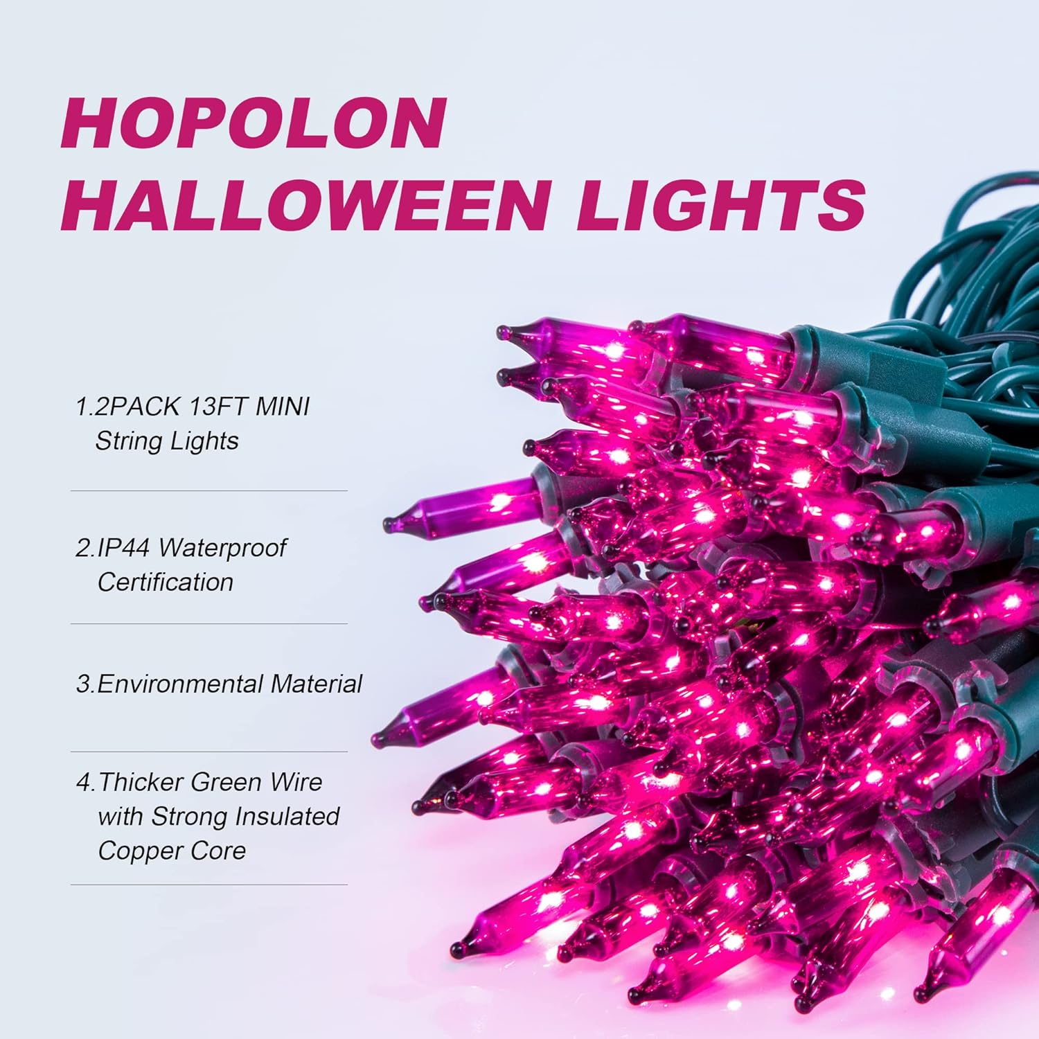 - 👻2Pack Incandescent Halloween Lights:Hopolon 2 PACK 50L Purple Halloween mini lights is 13ft in total-Green wire with Bulbs: 3.5m/11.5ft, cord without lights50cm/1.5ft, spacing between every bulb: 7cm/2.76in. With Thicker green wire with strong insulated copper core, tangle-free to use,High quality UL certified products create a horrifying festive atmosphere, surely lights up your room and house. A spooky decorative lights at night to make your home a horror sight in the neighborhood!