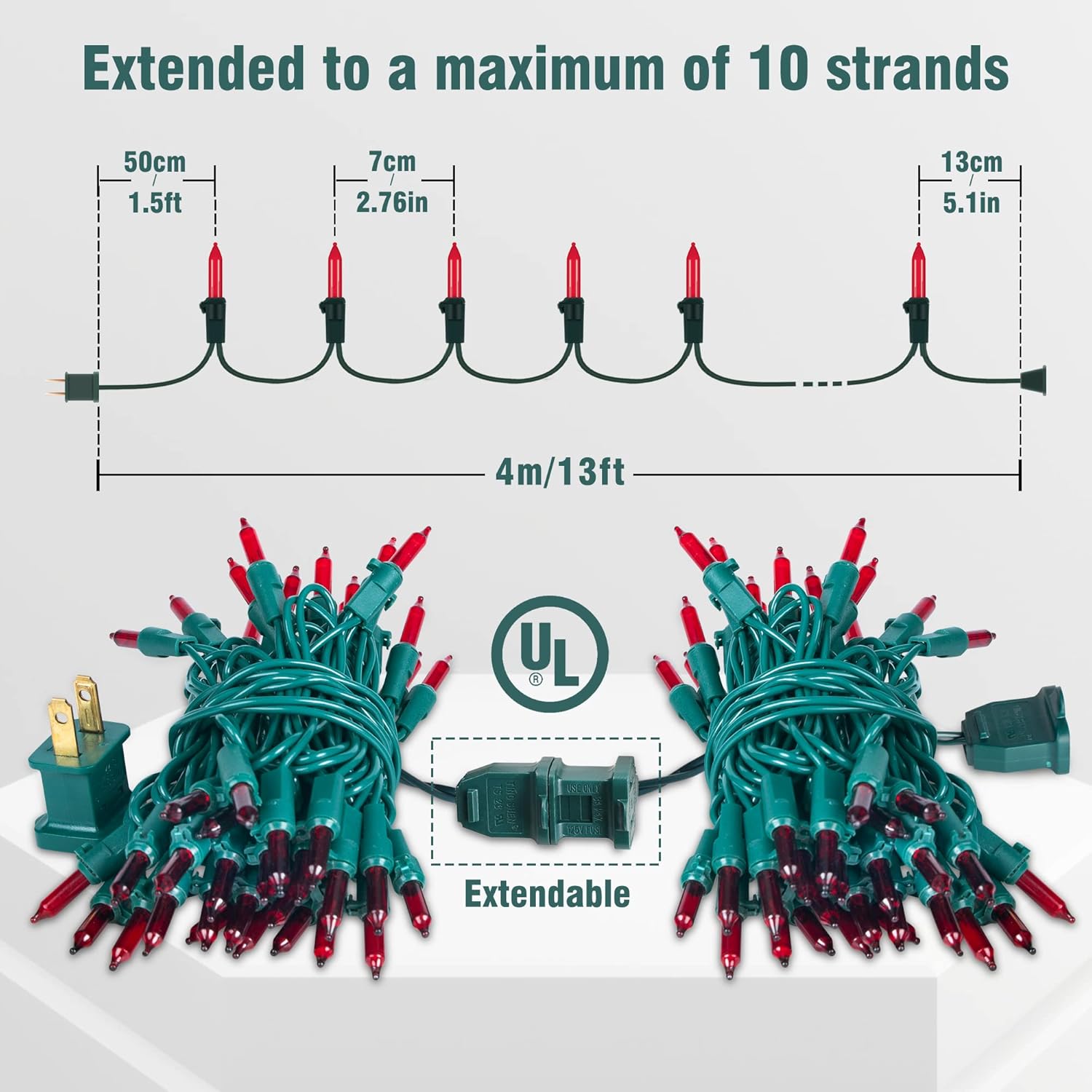 - 🎈Connectable Christmas Lights Red:Beewin 2pack red Christmas mini lights,each string of Christmas lights has 13ft green wire length and 50 incandescent bulbs are each spaced 2.76 inches(7cm) apart.Up to 10 string of lights connectable, which will make you get 130 feet 500 lights to customize your need for large area decorations.