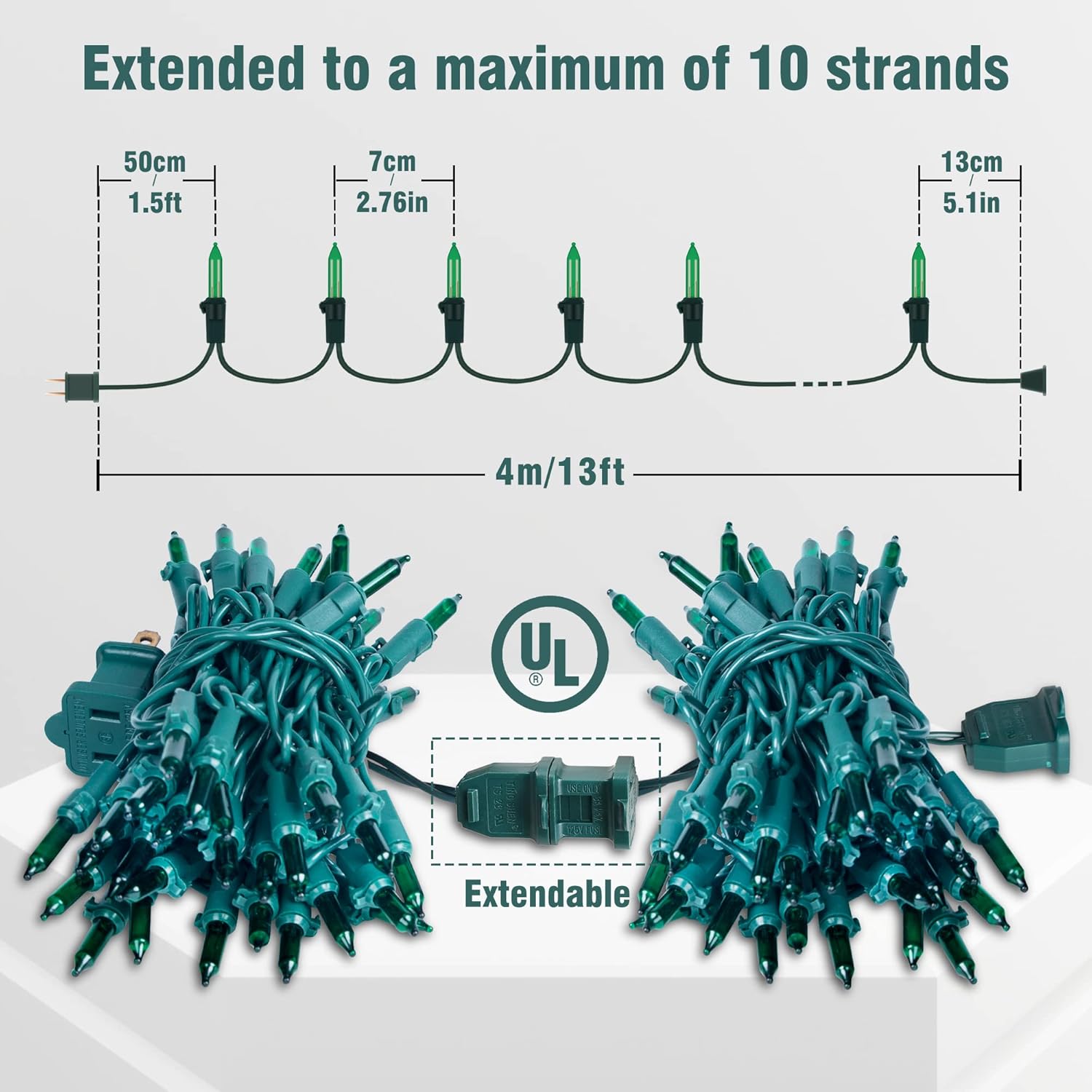 - â100 Incandescent Christmas Lights:Beewin Old-fashion incandescent Christmas green lights with green wire,2PACK 50Count 13Feet Clear Christmas Mini String Lights,each bulb space 2.76in.High quality UL certified products ensure the safety of you and your family.