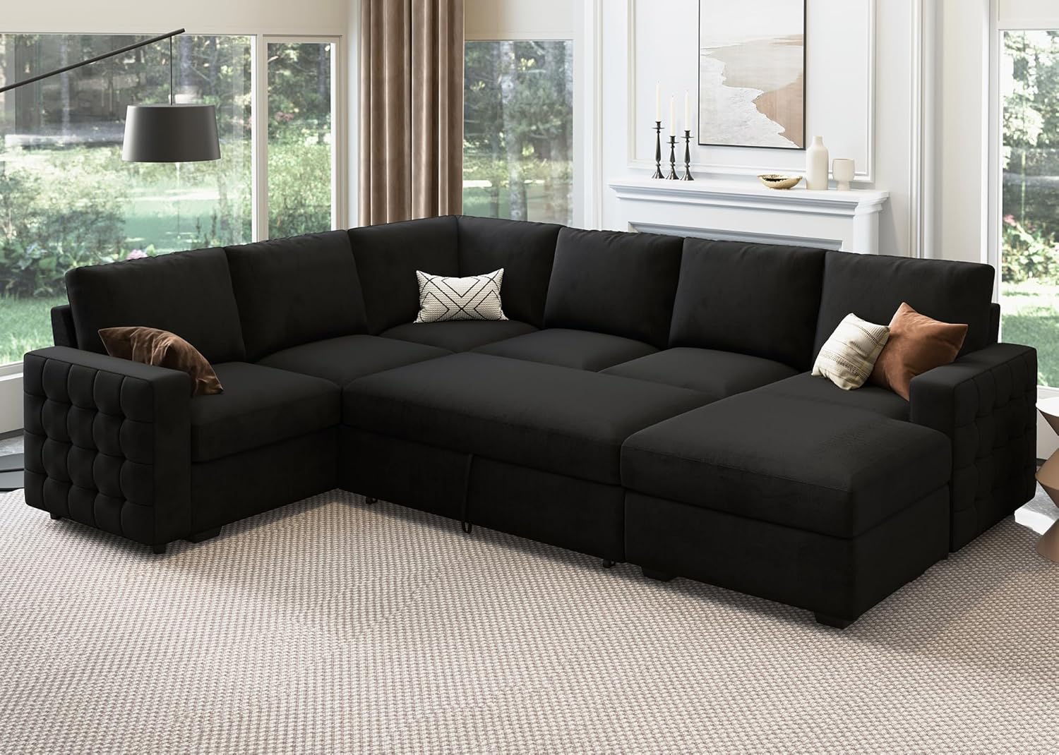 HONBAY Sectional Sleeper Sofa with Pull Out Bed U-Shape Sectional Couch with Storage Chaise 6 Seater Sleeper Sectional Sofa Bed, Velvet Black
