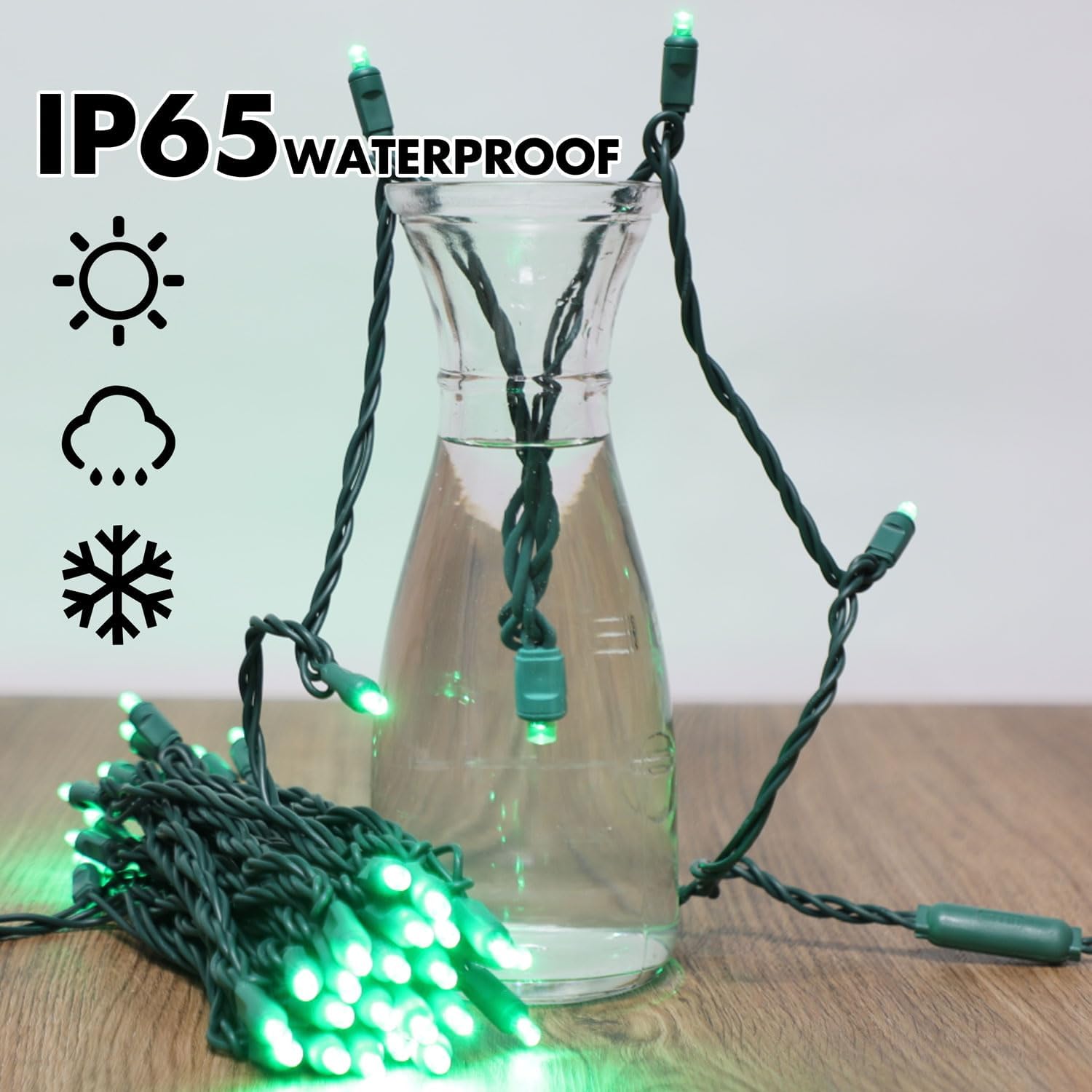 - One-Piece 5MM Commercial Decoration LIGHTS : 50ft 100 LED Lights (50 Lights 25ft X2Groups), 6-inch spacing. Green wires have a wide range of uses and are perfectly integrated with green plants or shrubs.no extra adapter is needed,bulbs are cool to touch,with the rectifier,keep the light steady (not twinkle).