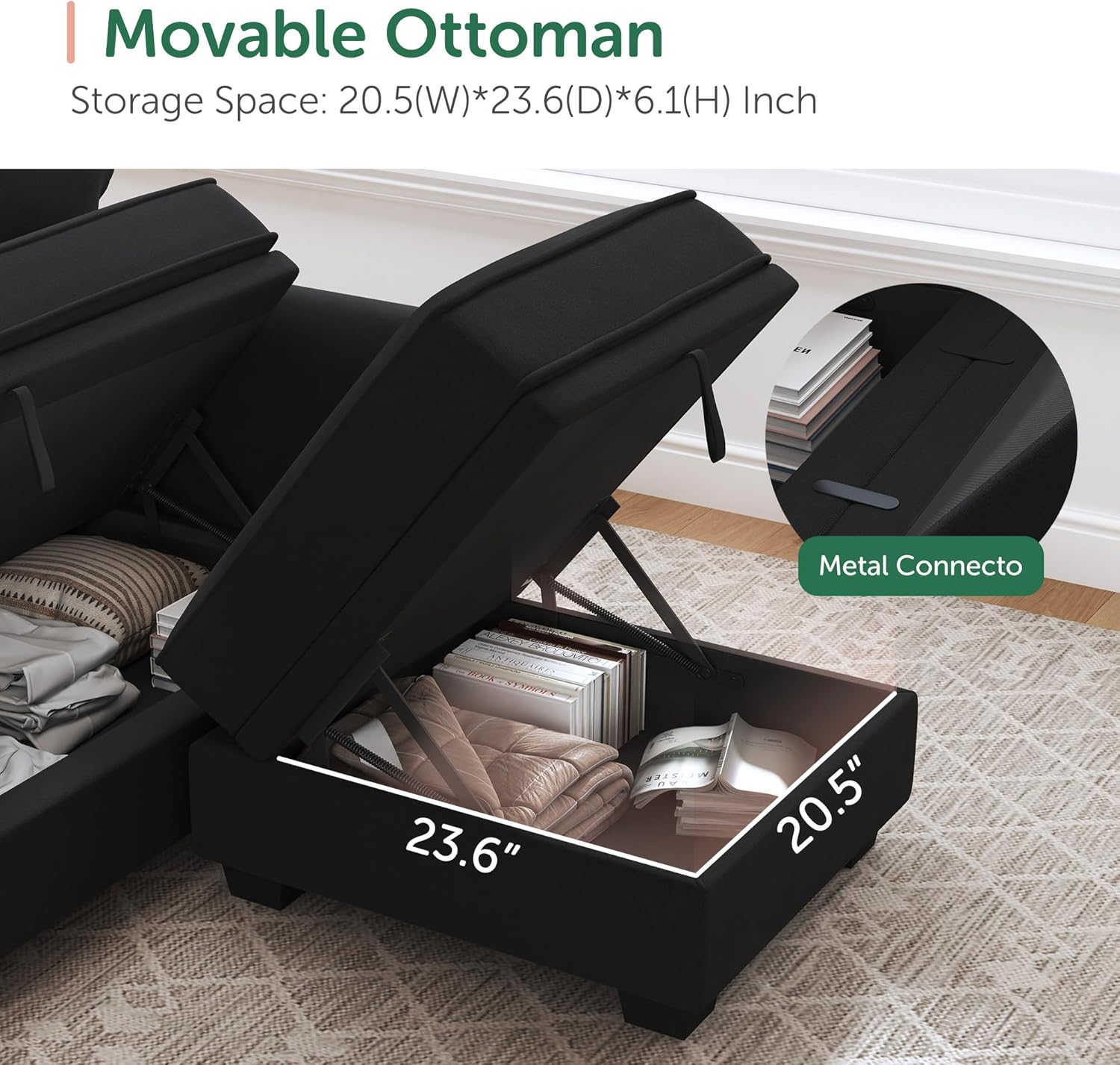 - Movable Ottoman: The Sectional sofa is composed of a 4 seat sofa and 2 movable ottoman. Ottomans can be connected to the 4 seat sofa by connecting pieces to form a U shaped sofa. Ottomans can also be placed individually according to your needs
