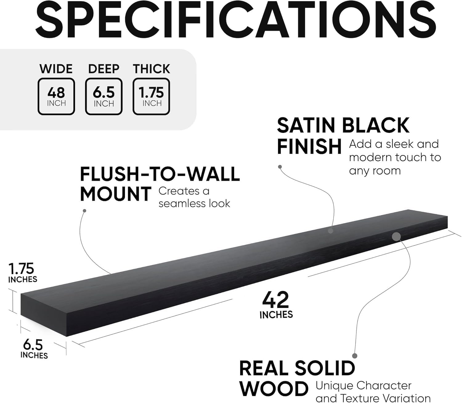 - AUTHENTIC WOOD GRAIN - Enjoy the timeless elegance of real wood. Handcrafted from the finest 1.75" Thick natural pine wood measuring 42" Wide x 6.5" Deep x 1.75". Our shelves highlight the inherent charm and durability of high-quality wood. Each Shelf reveals its unique character of knots and natural wood grain; each ledge is a little different but equally stunning.