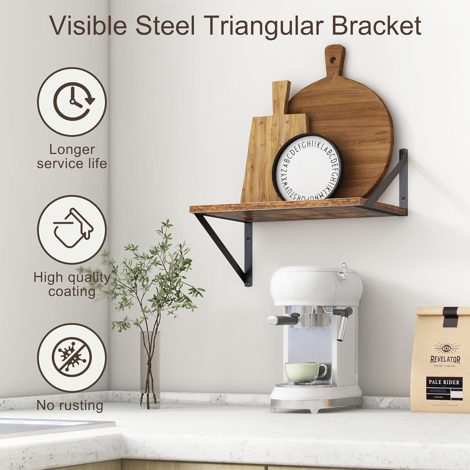 - ăFARMHOUSE RUSTIC WALL SHELFăThese floating shelves are made of premium engineered wood board and visible triangular bracket. The rustic wooden grain surface add character and warmth to any modern or traditional interior with these deep floating shelves, contrast shelves at staggering heights on the wall or mount side-by-side or in the corner for a clean streamlined look.