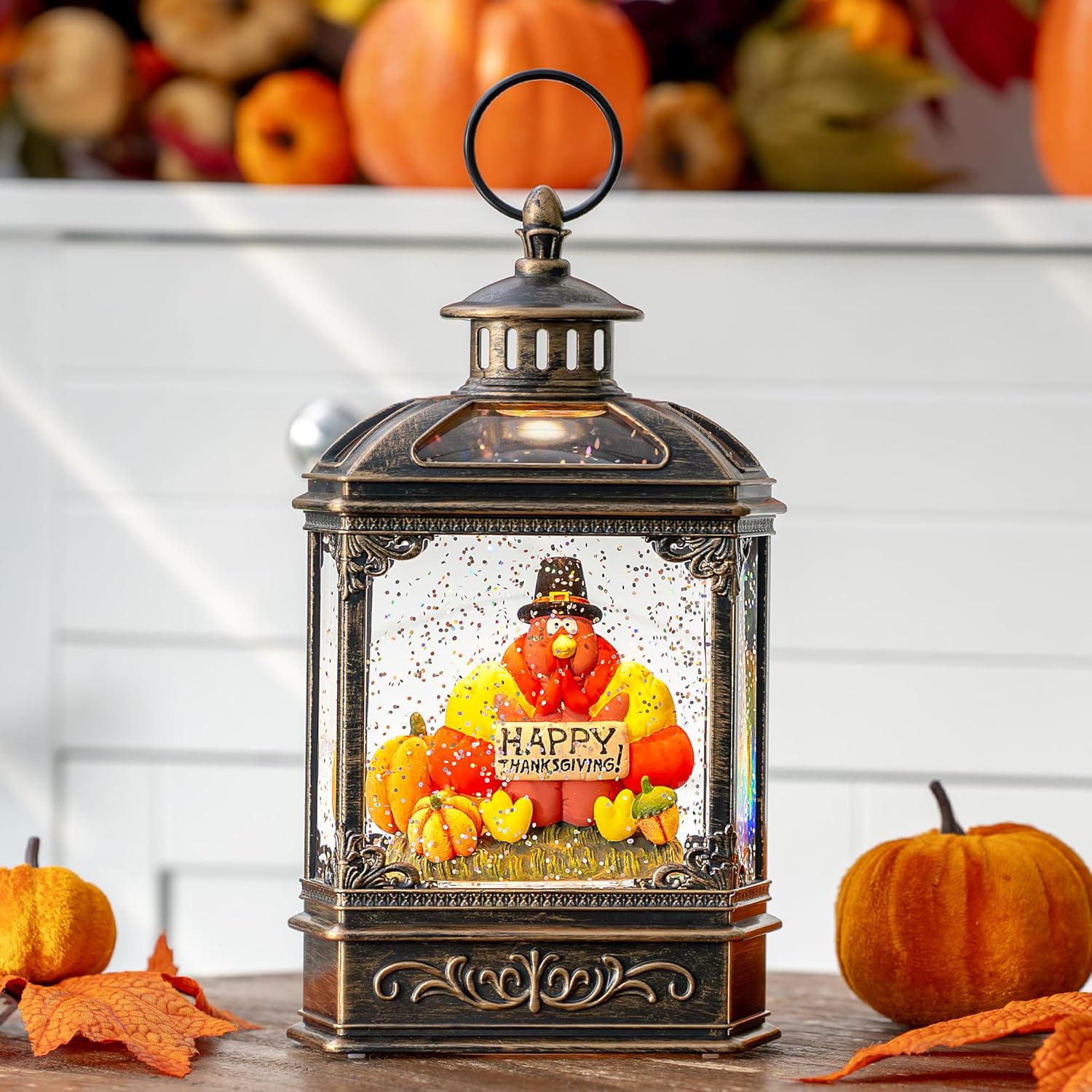 - 🦃🎃【Celebrate Fall Harvest Day】When turned on, our bronze harvest lantern features a turkey with “HAPPY THANKSGIVING” Sign, as well as wheat field, pumpkins, and fall scenes inside. The warm LED shines on the figurines while the swirling glitter gives our harvest lantern a beautiful fall feel.